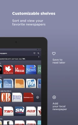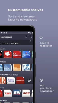Um Ihr Leseerlebnis noch persönlicher und angenehmer zu gestalten, bietet Canadian Newspapers eine Reihe innovativer Funktionen. Wechseln Sie in den augenschonenden Dunkelmodus, organisieren Sie Ihre Merklisten nach Belieben und markieren Sie Artikel als Favoriten, um sie jederzeit mühelos wiederzufinden. Die intuitive Drag-and-Drop-Funktion ermöglicht es Ihnen, Zeitungen und ganze Kategorien genau nach Ihren Vorstellungen anzuordnen. Und für maximale Flexibilität können Sie Nachrichtenartikel bei Bedarf direkt in einem externen Browser öffnen. Canadian Newspapers ist mehr als nur eine Nachrichten-App; es ist Ihr personalisiertes Fenster zur vielfältigen Medienlandschaft Kanadas.