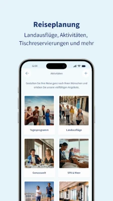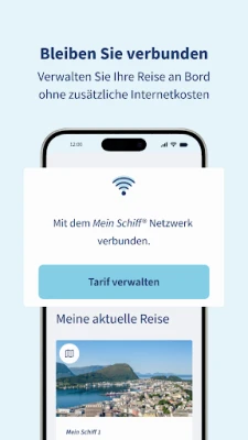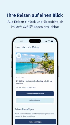 Mit Ihrem persönlichen Mein Schiff® Konto behalten Sie den vollen Überblick über all Ihre Seereisen, inklusive vergangener Abenteuer. Gestalten Sie Ihren Aufenthalt aktiv: Sichern Sie sich bis zu vier Monate im Voraus die besten Plätze in den Spezialitätenrestaurants, reservieren Sie entspannende SPA-Anwendungen, nehmen Sie an spannenden Sportkursen teil und buchen Sie unvergessliche Landausflüge. Informieren Sie sich jederzeit über das aktuelle Bordprogramm, sichern Sie sich begehrte Workshop-Plätze und haben Sie dank Ihres individuellen Reiseplans alle Termine und Aktivitäten fest im Blick. Auch die Reise-Checkliste und das Schiffsmanifest erledigen Sie bequem und papierlos direkt in der Mein Schiff® App.
