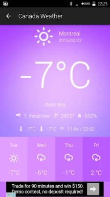Entdecken Sie eine Welt der präzisen Wetterinformationen direkt an Ihren Fingerspitzen mit Météo Canada. Diese sorgfältig entwickelte App bietet Ihnen einen unvergleichlich einfachen und intuitiven Zugang zu den aktuellen Wetterbedingungen und der Luftqualität – jederzeit und überall in Kanada. Erleben Sie, wie Météo Canada die Komplexität der Meteorologie in eine klare, verständliche Darstellung verwandelt, sodass Sie stets optimal informiert sind, bevor Sie das Haus verlassen.