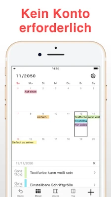 Die unkomplizierte Bedienung steht im Vordergrund: Mit nur einem Antippen können Sie mühelos neue Ereignisse anlegen, Aufgabenlisten verwalten und präzise Erinnerungen oder Alarme setzen, um niemals einen wichtigen Termin zu übersehen. N Calendar passt sich flexibel an Ihre individuellen Anforderungen an – sei es als präzises Arbeitsjournal, detaillierter Lernplaner oder um Urlaubsfreuden und gemeinsame Familienzeiten stressfrei zu organisieren. Die flexible Ansicht in Tages-, Wochen- oder Monatsübersicht passt sich dabei stets Ihren Bedürfnissen an, während farbliche Markierungen für sofortige Klarheit in Ihrem Zeitplan sorgen.